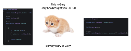 Another old programmer here, and I don’t see the issue. C# gets better with every release and the null coalescing assignment operator is very handy. It also exists in JavaScript.
