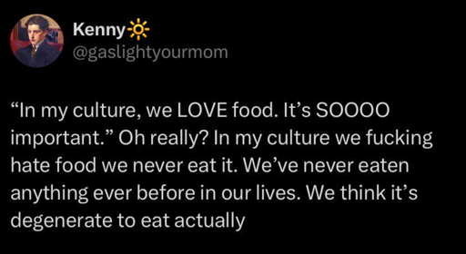 Like, this thread is full of jokes about how some cultures have shitty food, but that subjective assessment is very different than the idea that food’s mere purpose is nutrition. It implies it has no ceremonial use.